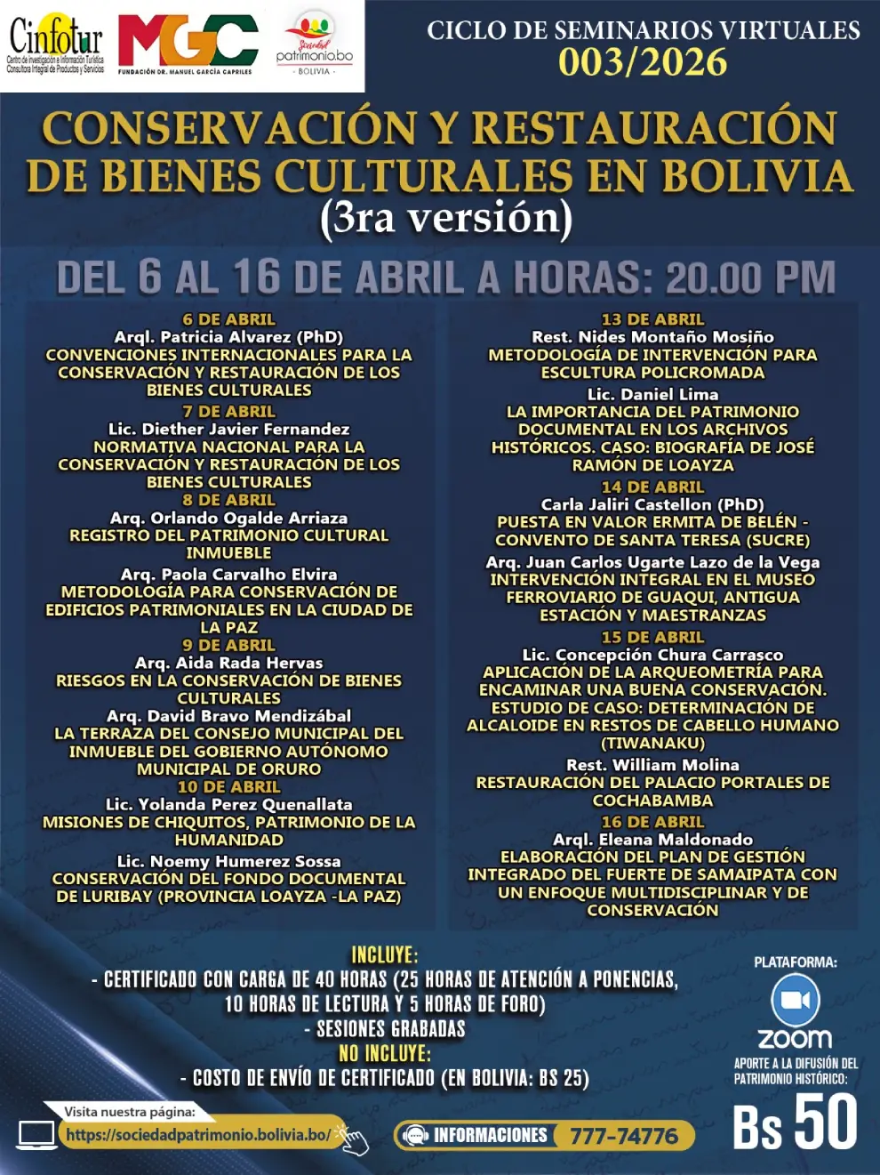 En esta tercera versión han aceptado participar profesionales que día a día sensibilizan a sus entornos sobre la importancia de conservar y restaurar los bienes culturales a los que se atribuye unos valores que los hacen únicos e incluso excepcionales. Además, ellos emplean todo su conocimiento para lograr que estos objetos sean trasmitidos a las generaciones venideras en las mejores condiciones posibles. Esa es la herencia que hemos recibido, disfrutado y legado a quienes nos reemplazarán.