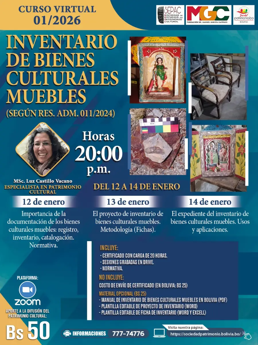 La primera acción técnica fundamental de valorización e identificación del bien cultural es el inventario. Para ello se emplea una ficha donde se consignan datos como la denominación del bien, su descripción, las dimensiones y el estado de conservación, entre otros aspectos relevantes. En Bolivia esta tarea se encuentra normada mediante la Resolución Administrativa 011/2024 que aprueba la Guía para la Conservación, Protección y Manejo de Bienes Culturales Muebles en el Estado Plurinacional de Bolivia y Anexos.